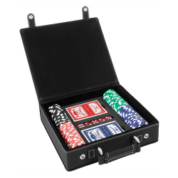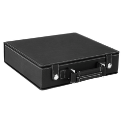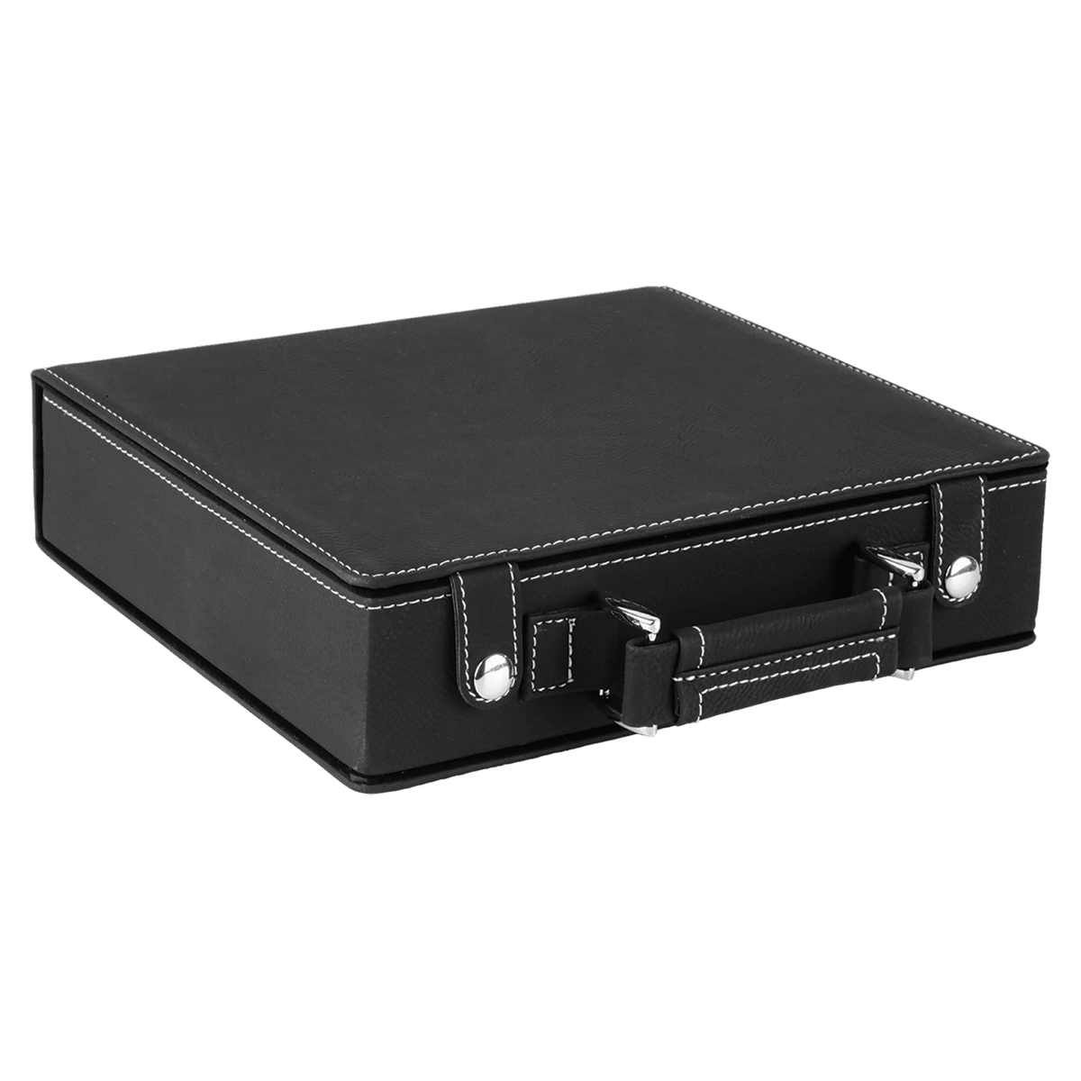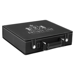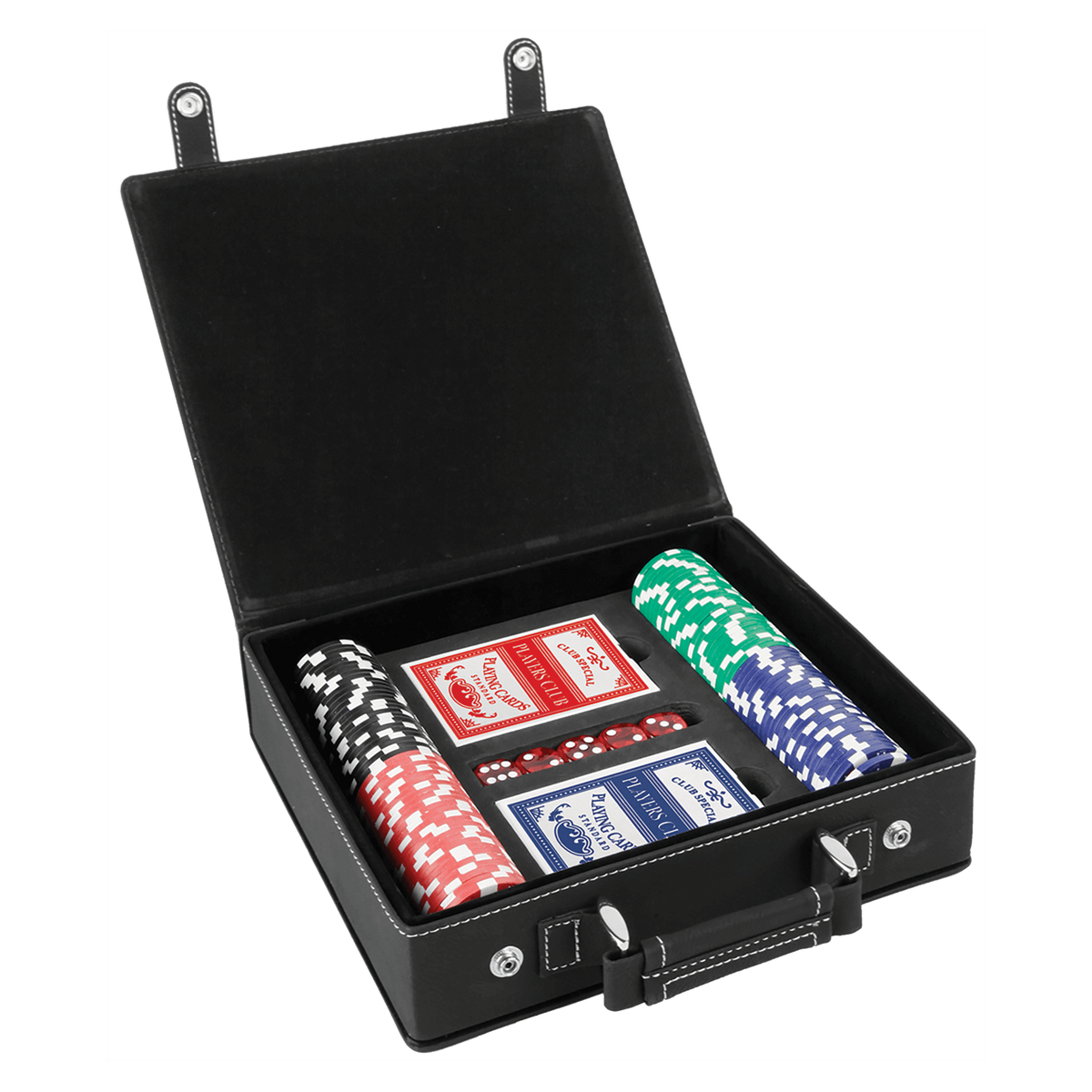 Leatherette offers the look and feel of genuine leather at a fraction of the price. This richly textured, synthetic material is water resistant, easy to clean and durable enough for the rigors of daily use. The poker set includes 100 commercial grade chips (not laserable), 2 decks of cards, and 5 dice. The inside of the box has black, felt lining. The poker set has a handle and 2 snaps for closure. Laser Engraved leaving an elegant silver imprint color. Individually packaged.